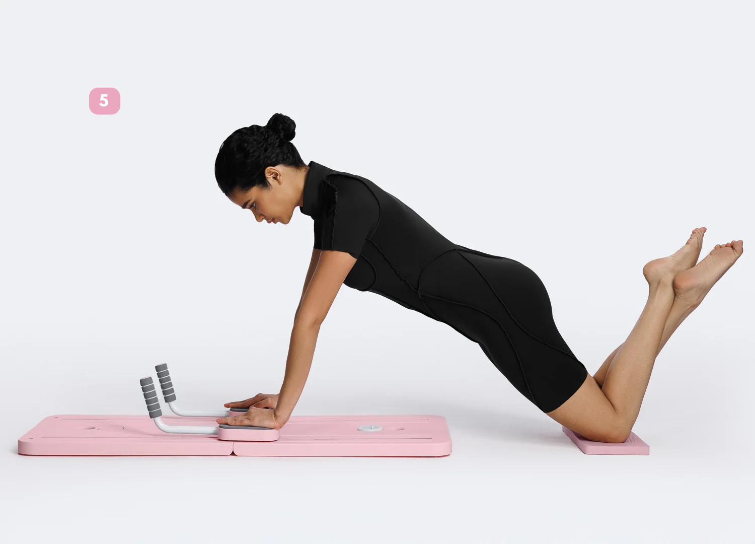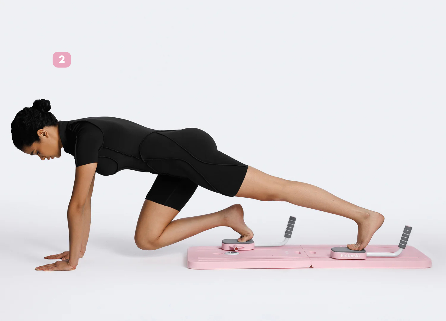 Stand at the base of your reformer, the moving planks close to your end. Bend down without bending your knees and put your hands on the planks. Move them forward and backward. Keep your feet on the ground and your back straight.